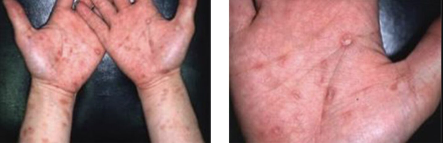 - 手のひらや足の裏などに赤い発疹が現れる